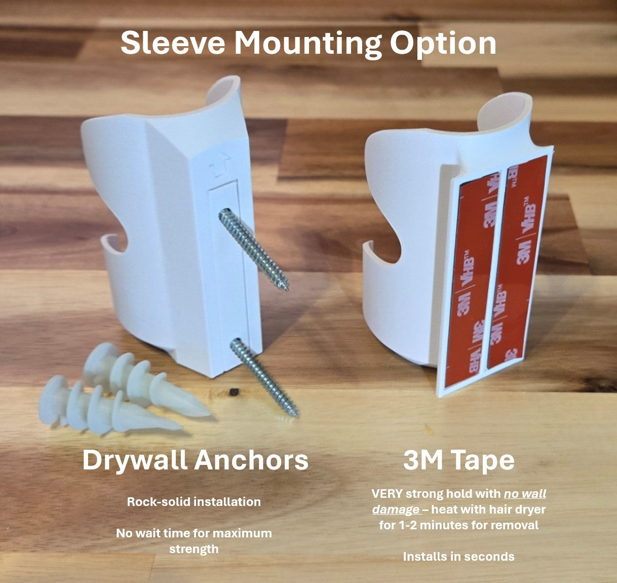 All accessories and wall plug mount with very strong pre-installed 3M tape. You have the option of 3M tape or drywall anchors for the FlexStyle sleeve - you can't go wrong with either!